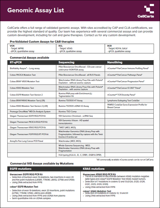 CellCarta offers a full range of validated genomic assays. With sites accredited by CAP and CLIA certifications, we provide the highest standard of quality. Our team continually develops new biomarker assays and has experience with several commercial assays. Contact us for any custom development.