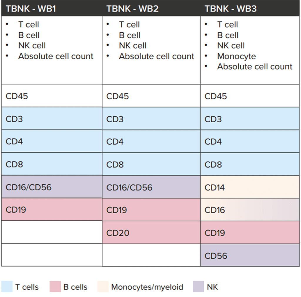 • TBNK + monocytes panel (WB3): adds CD14, CD16, and CD56 to extend analysis to monocytes and NK-cell subsets